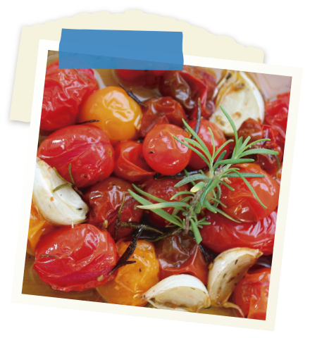 Verter la vinagreta sobre los tomates y removerlos bien con las manos para que se unten bien por todas partes. Llevar la bandeja al horno y dejarla entre 15 y 25 minutos, depeniendo del tamaño de los tomates. Si no están listos, dejarlos más tiempo, vigilando cada cinco minutos. Servir con alguna de las sugerencias anteriores (o cualquier otra de creación propia)